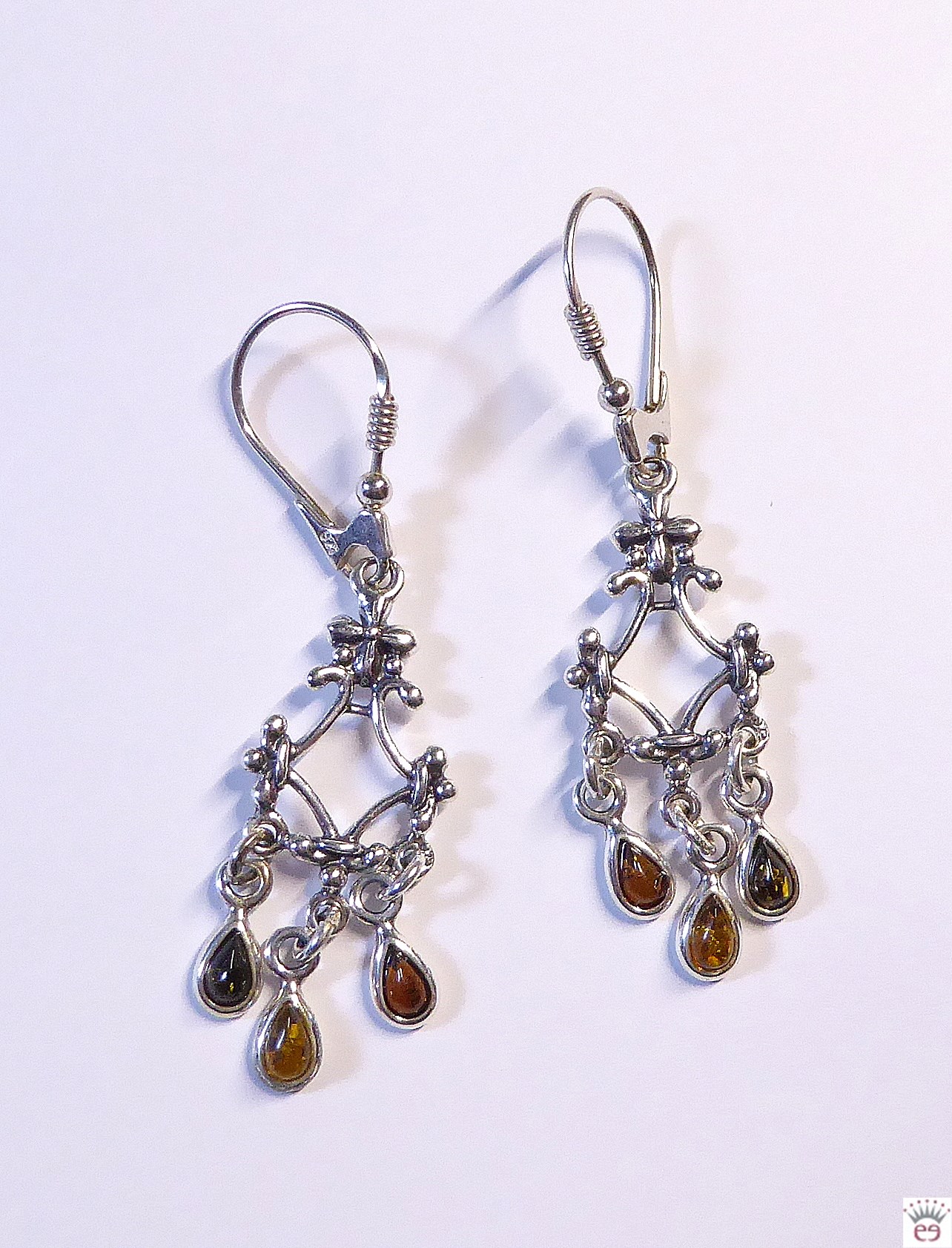 Silberohrhänger mit drei kleinen Bernstein-Cabochons in Tropfenform in den Farben cognac, gelb und grün