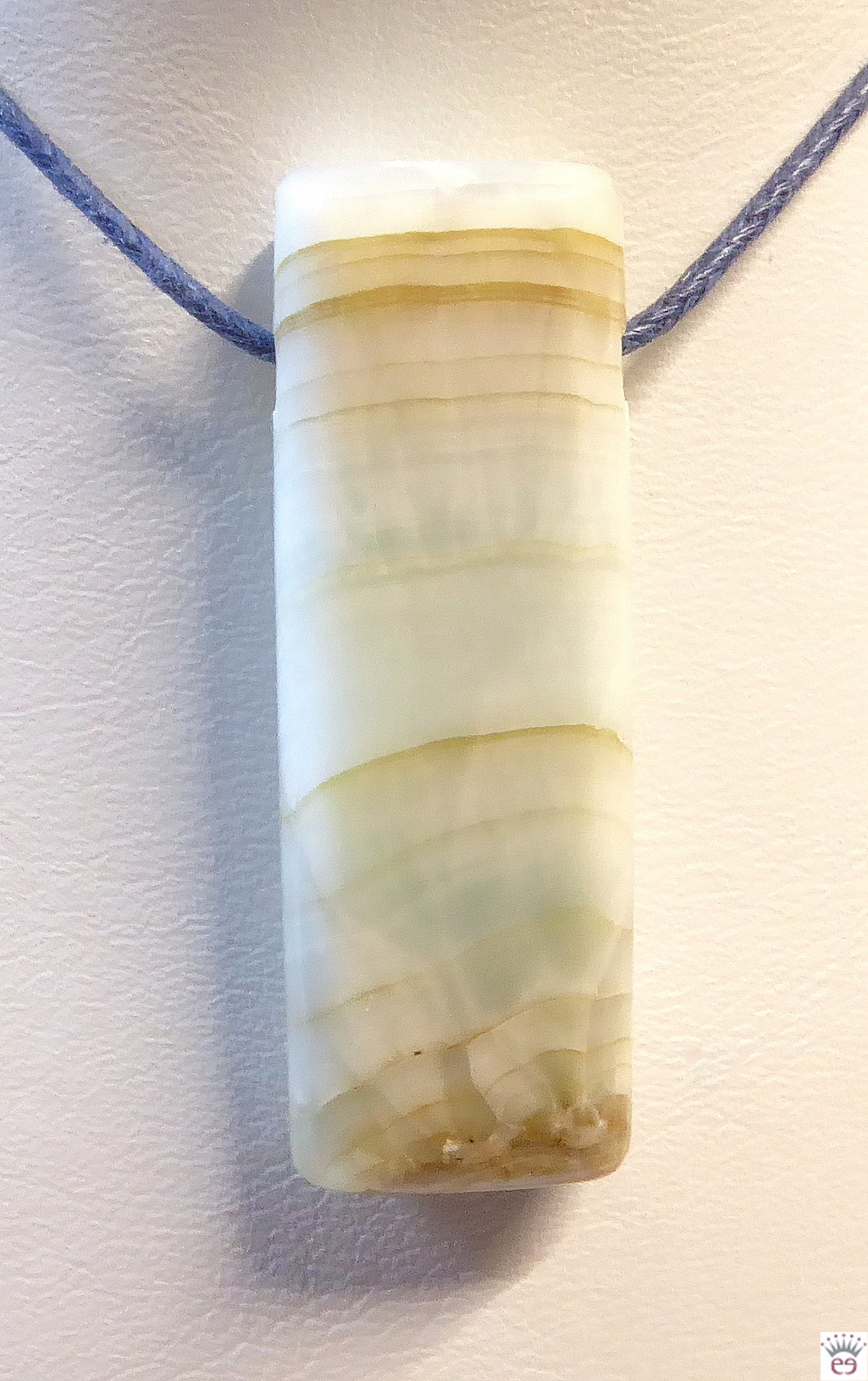 Quaderförmiger Edelsteinanhänger aus hellblauem Calcit. Beidseitig glatt geschliffen und daher von beiden Seiten zu tragen.