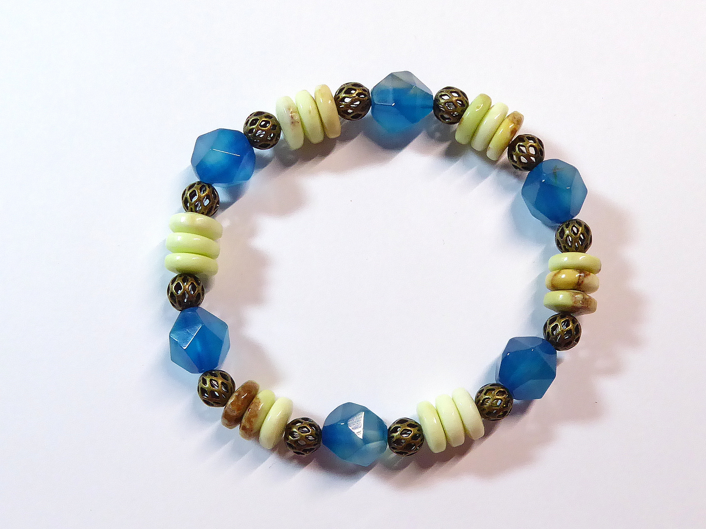 Edelsteinarmband mit geschliffenen und blau gefärbten Achat-Kugeln sowie Rondellen aus Zitronenchrysopras - kombiniert mit antikvergoldeten Messing-Kugeln