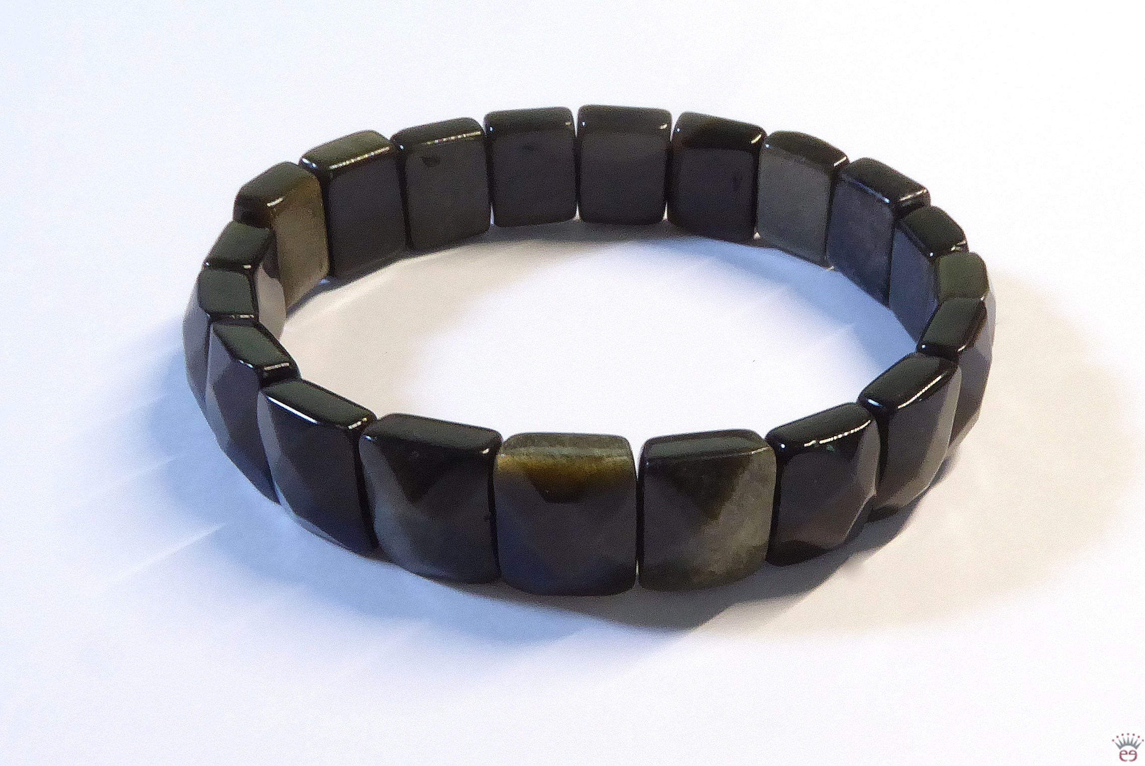 Edelsteinarmband mit rechteckigen und leicht facettierten Obsidian-Elementen. Die Rückseite ist glatt