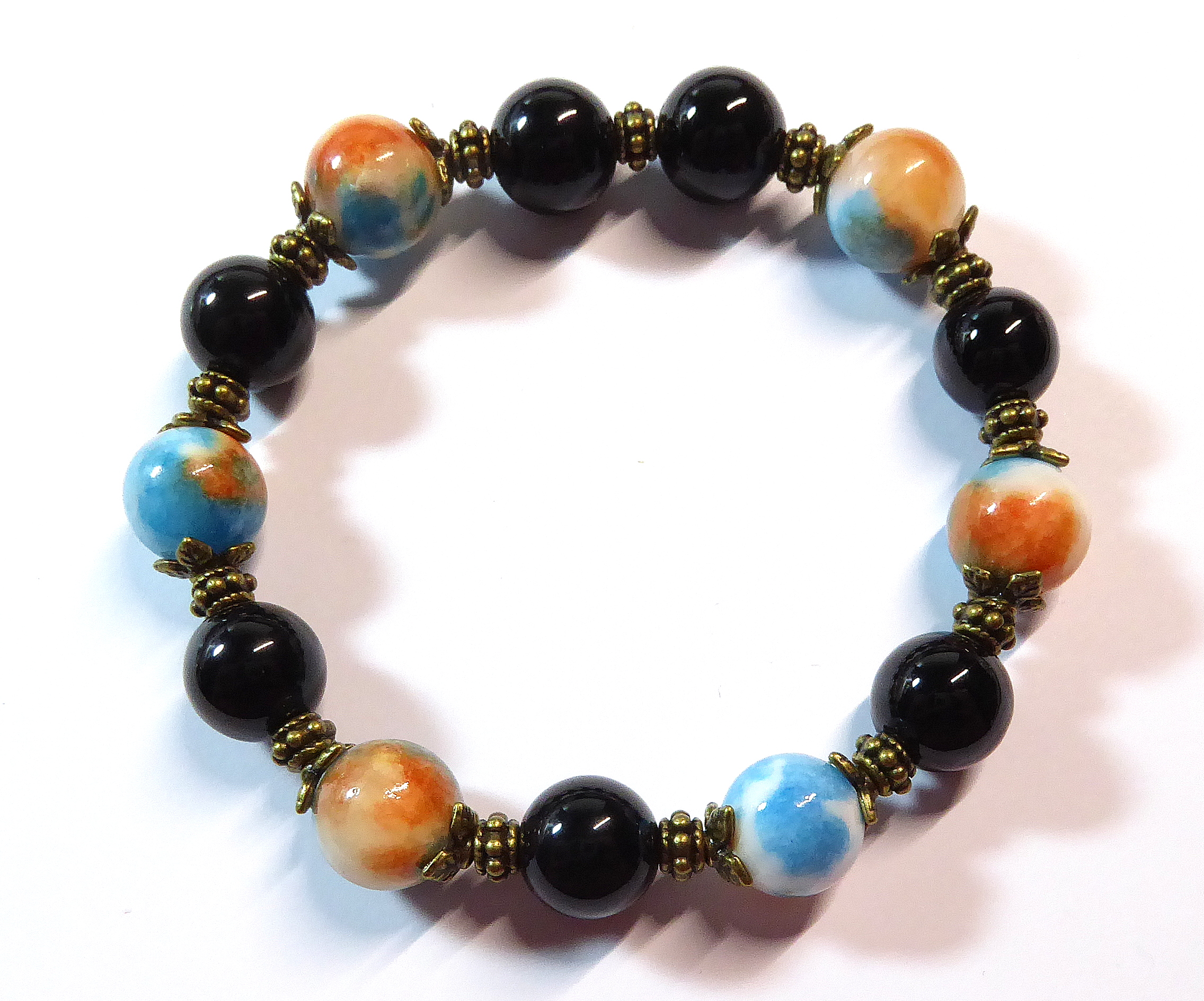 Edelsteinarmband mit Onyx- und gefärbten Jade-Kugeln sowie Perlkappen und Zwischenteilen aus Metall in Antik Bronze Farbe