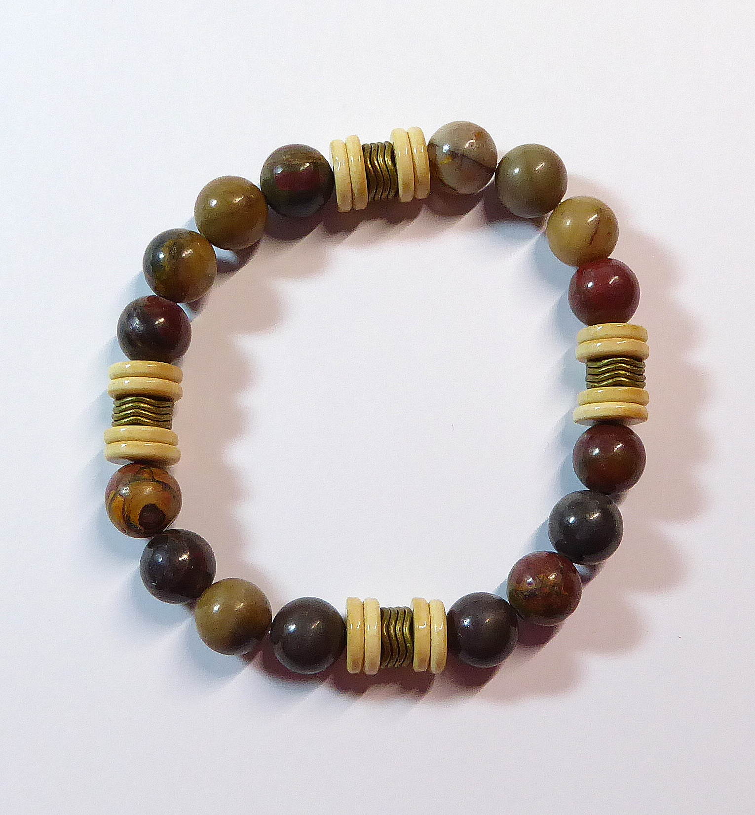Edelsteinarmband mit Kugeln aus Picassojaspis und Rondellen aus behandeltem Achat (gefärbt) - kombiniert mit Metall-Elementen in einer Antik Bronze Farbe