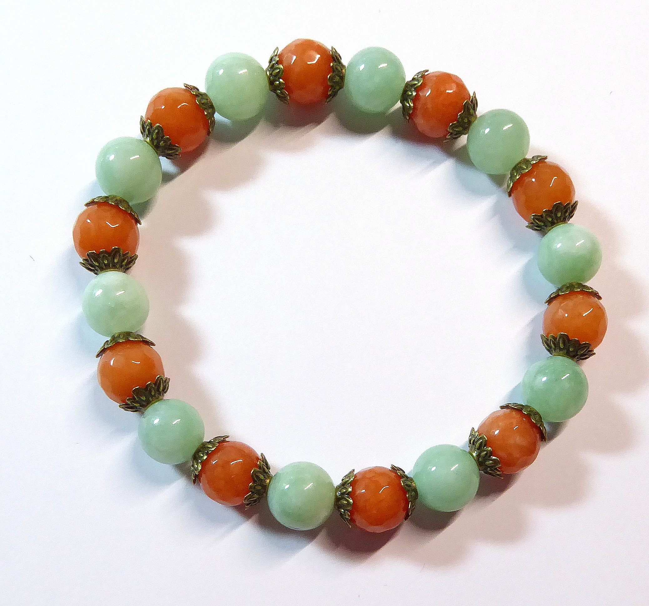 Edelsteinarmband mit grün gefärbten Jade-Kugeln sowie facettierten und orange gefärbten Jade-Kugeln sowie Perlkappen aus Metall in Antik Bronze Farbe
