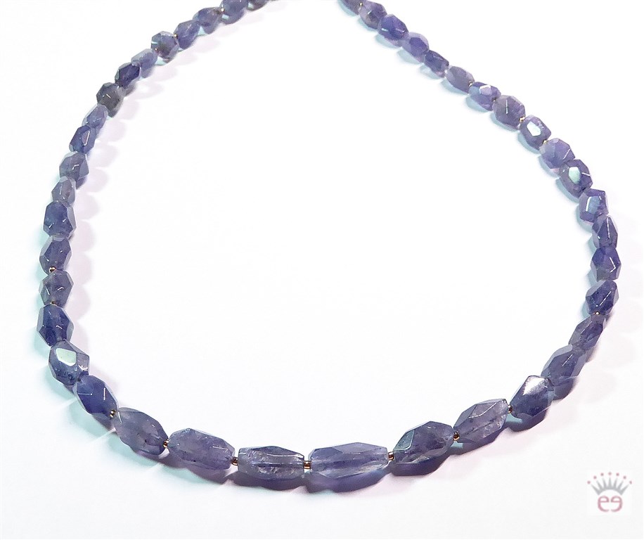 Edelsteinkette mit facettierten Iolith-Nuggets in leichtem Verlauf - getrennt durch rosé vergoldete Silberkugeln.