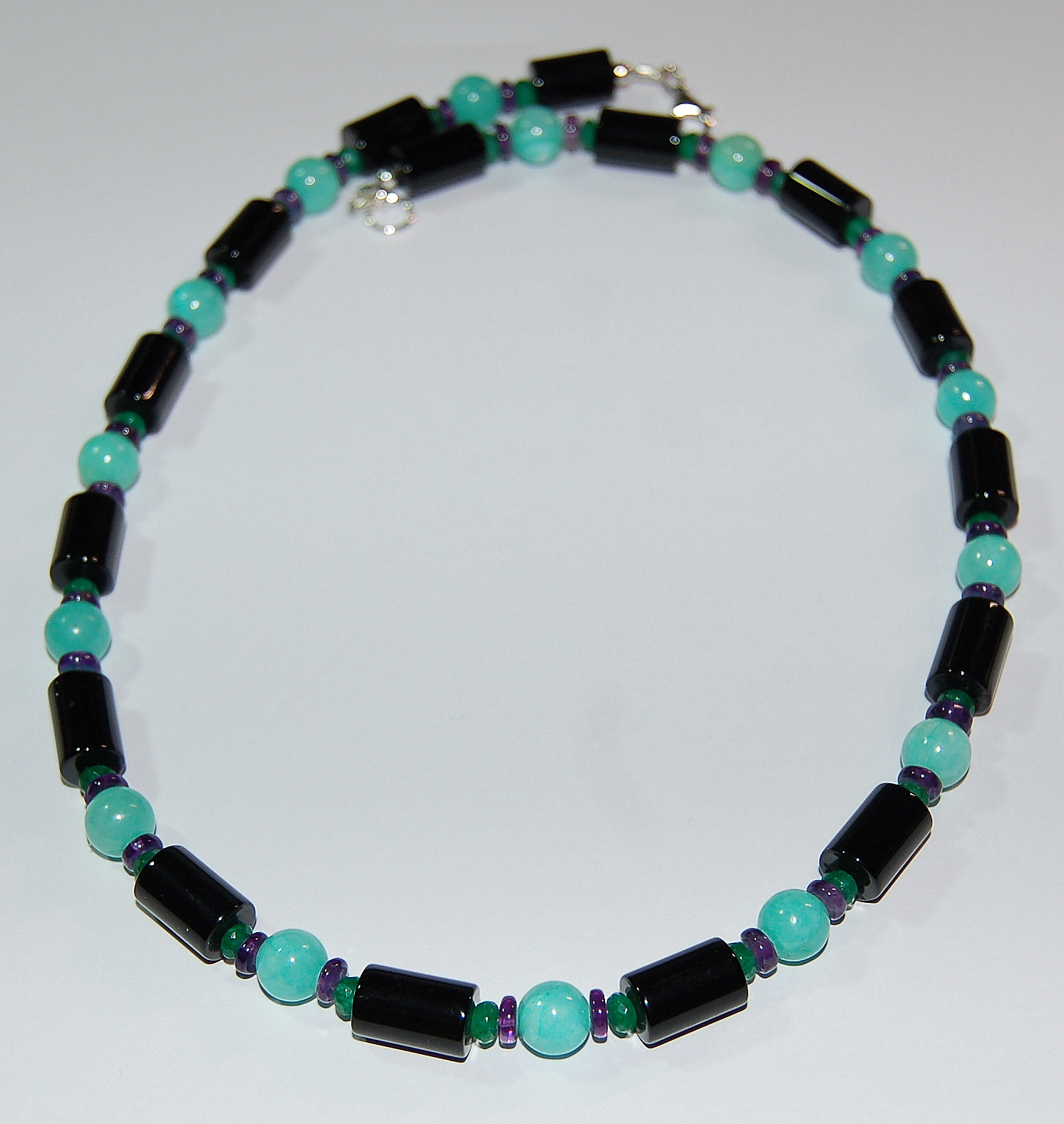 Eine schöne Edelsteinkette mit Onyx-Zylindern, kombiniert mit Rondellen aus grünem Achat und Amethyst sowie Hemimorphit-Kugeln in einem wunderbar frischen, hellen Türkis-Grün.