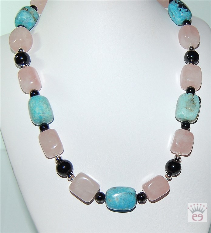 Edelsteinkette aus Rosenquarz- und Opal-blau-Nuggets (stabilisiert) sowie Onyx- und Silberkugeln und silberfarbenen Messing-Rondellen.