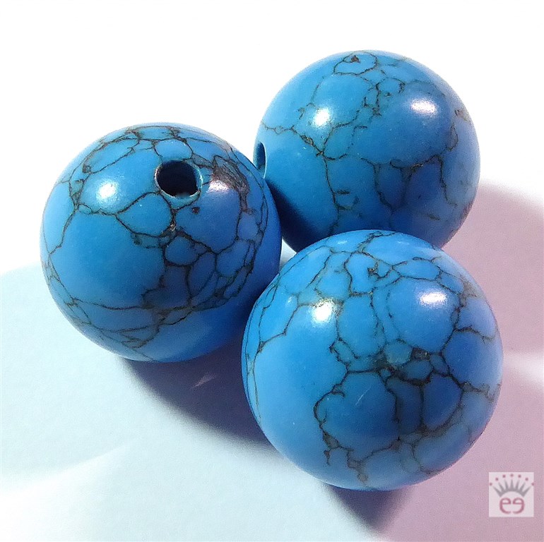 Edelsteinkugel aus Howlith türkis (gefärbt) mit großer Bohrung - also z. B. auch an einem schmalen Kautschuk- oder z. B. Omegareif zu tragen. Natürlich auch einfach an einem Band zu tragen oder als Zwischenteil für selbstgemachte Ketten zu verwenden oder in einem Kugelhalter.