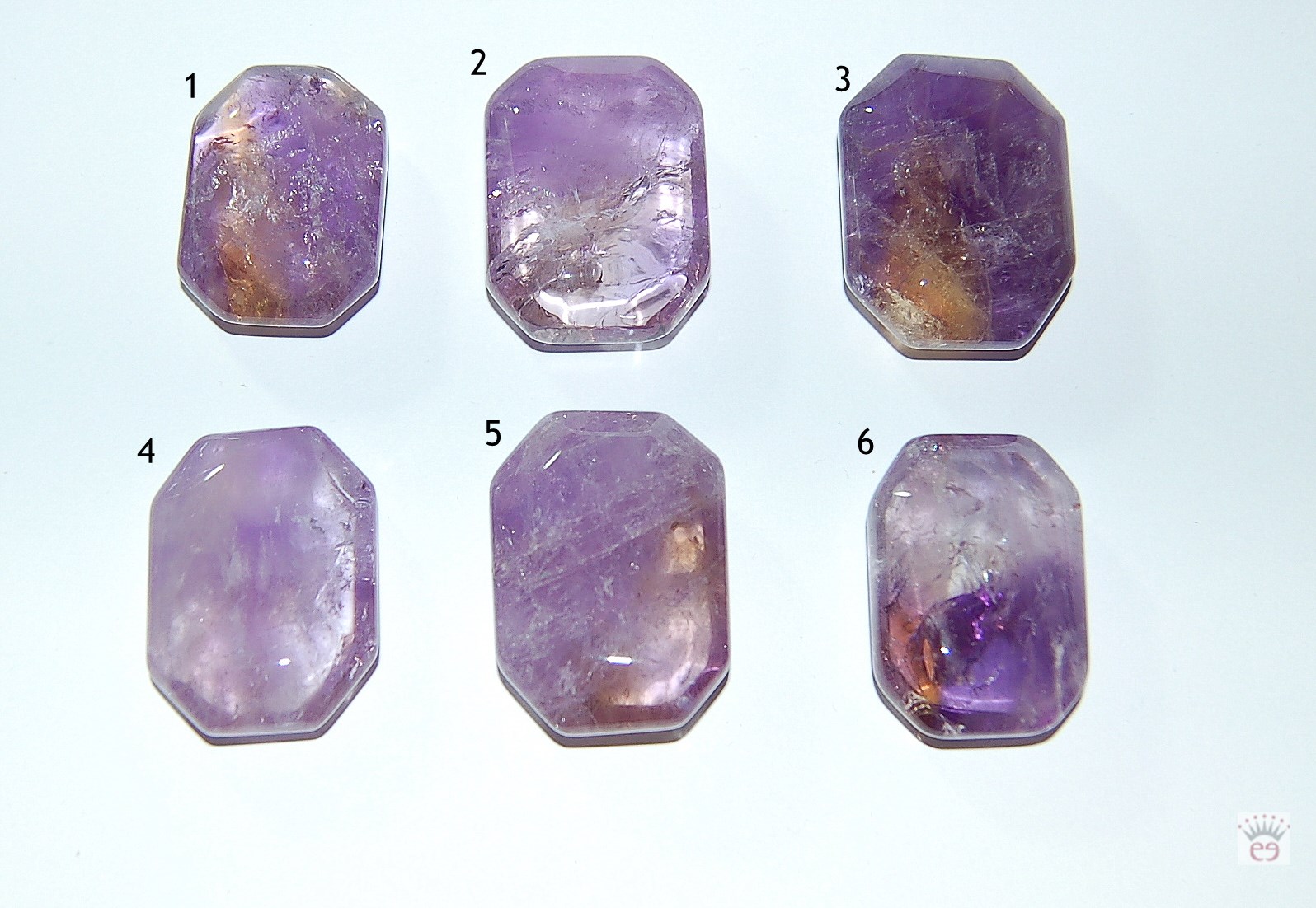 Achteckiger Flatstone aus Amethyst (bei genauerem Betrachten sind bei dem einen oder anderen Stein doch einige gelbliche Färbungen zu sehen, die eher an einen Ametrin denken lassen - auf dem Foto teilweise sehr gut zu erkennen - dieser Flatstone wurde aber als "Amethyst" beschriftet - es sollte nur mal erwähnt worden sein).