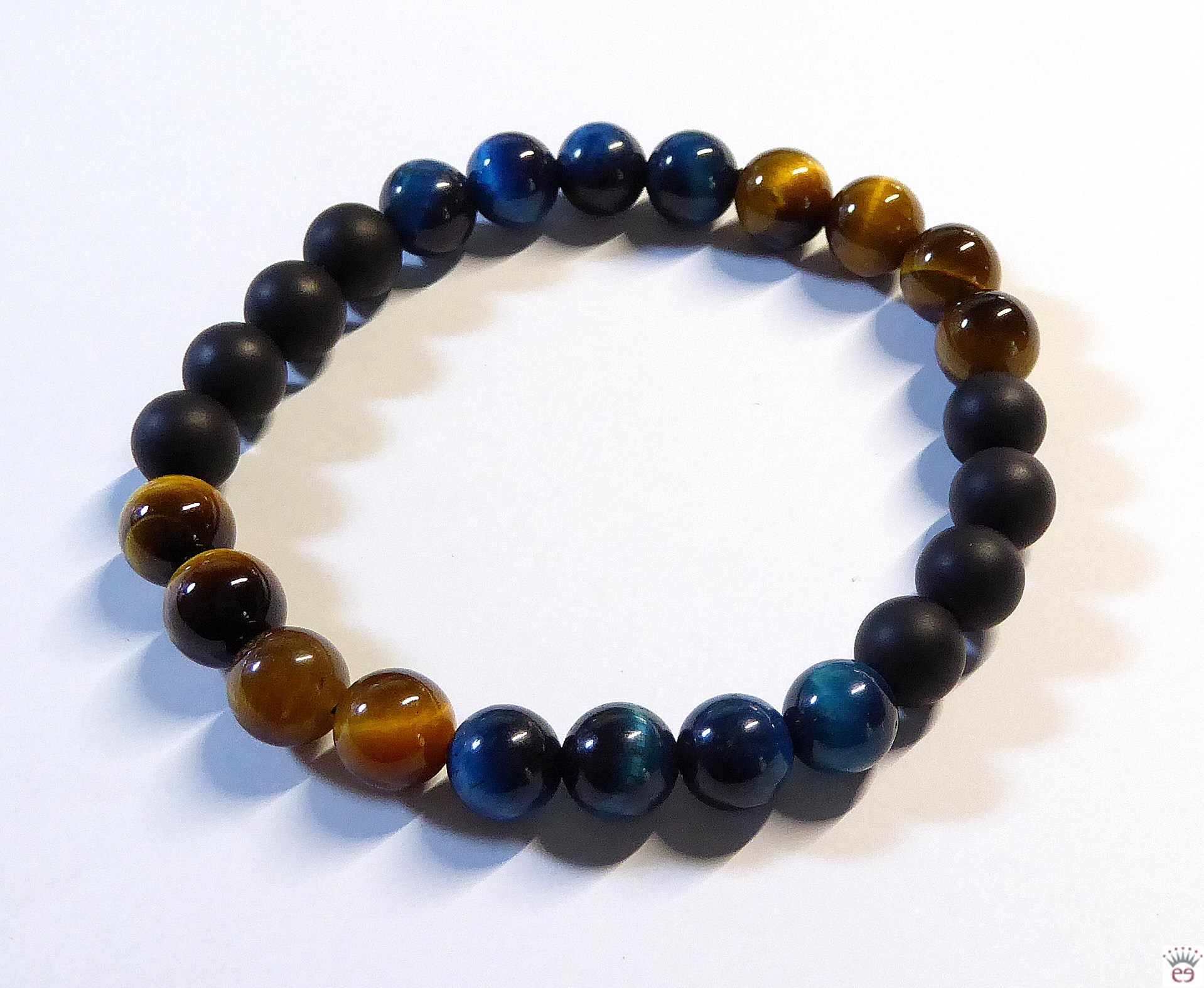 Edelstein-Kugelarmband mit matten, schwarzen Achat-Kugeln (gefärbt und erhitzt) und natürlichen Tigerauge- sowie dunkeltürkis gefärbten Tigerauge-Kugeln