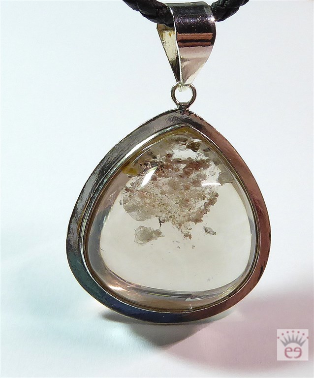 Silberanhänger mit Lodolit (Landschaftsquarz) in Tropfenform in einer breiten Silberfassung mit Rand und einer großen Silberöse..