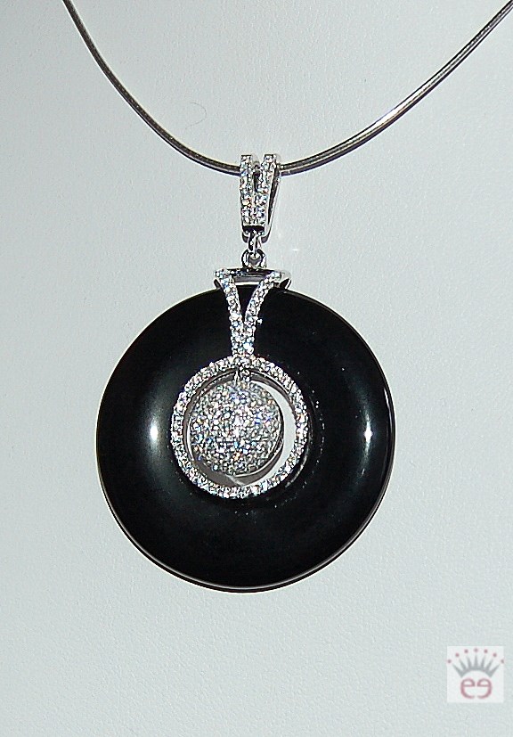 Onyx-Donut verziert mit Silber und weißen Zirkonia in Micro Pavé (was bedeutet, daß die Steine, die für diese Fassungsart genommen wurden, sehr nah beieinander gesetzt wurden, so daß vom Edelmetall kaum noch etwas zu sehen ist )
