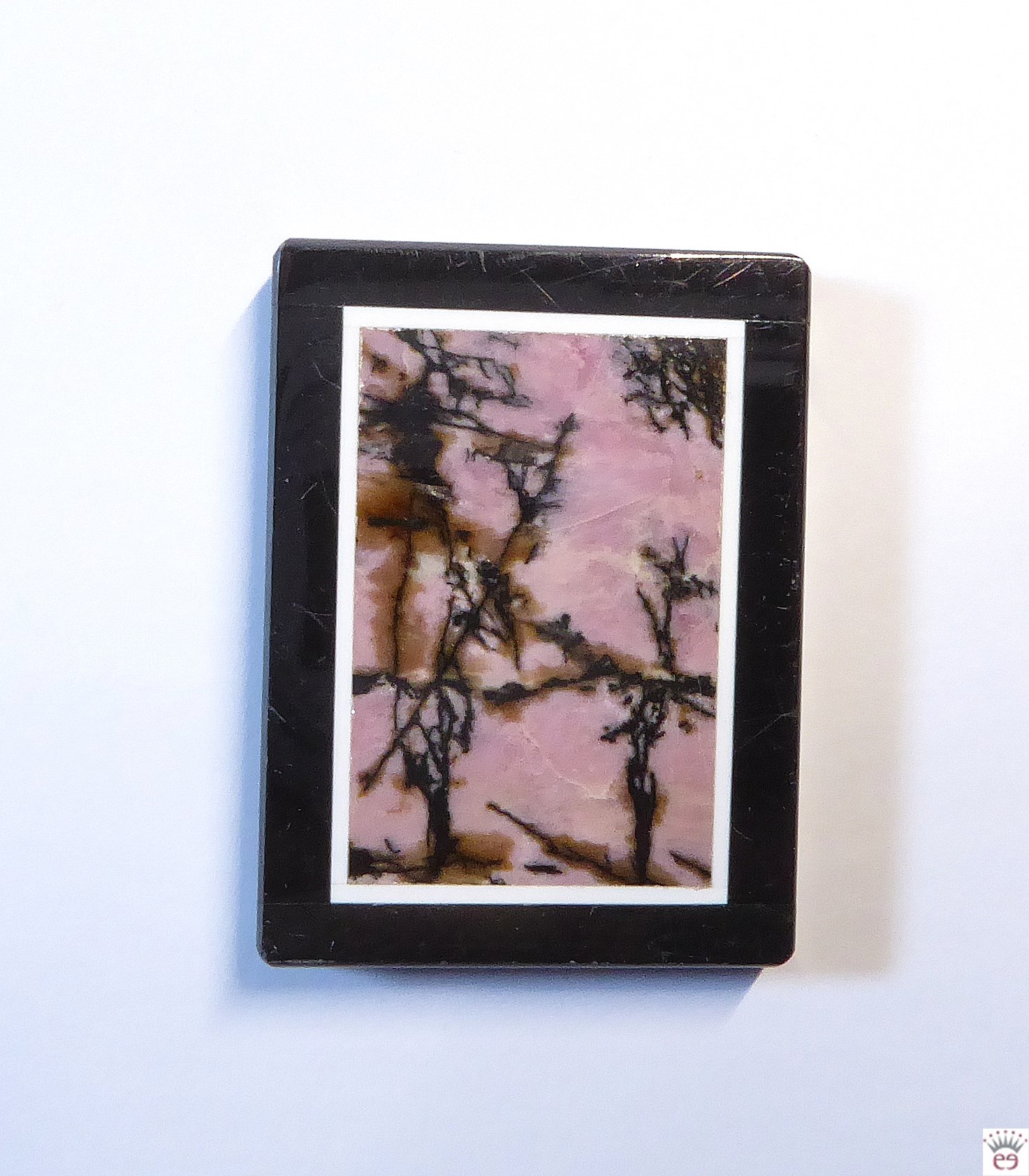Ein Anhänger wie ein Landschaftsbild: Edelsteinanhänger Rhodonit eingefasst in schwarzem Achat
