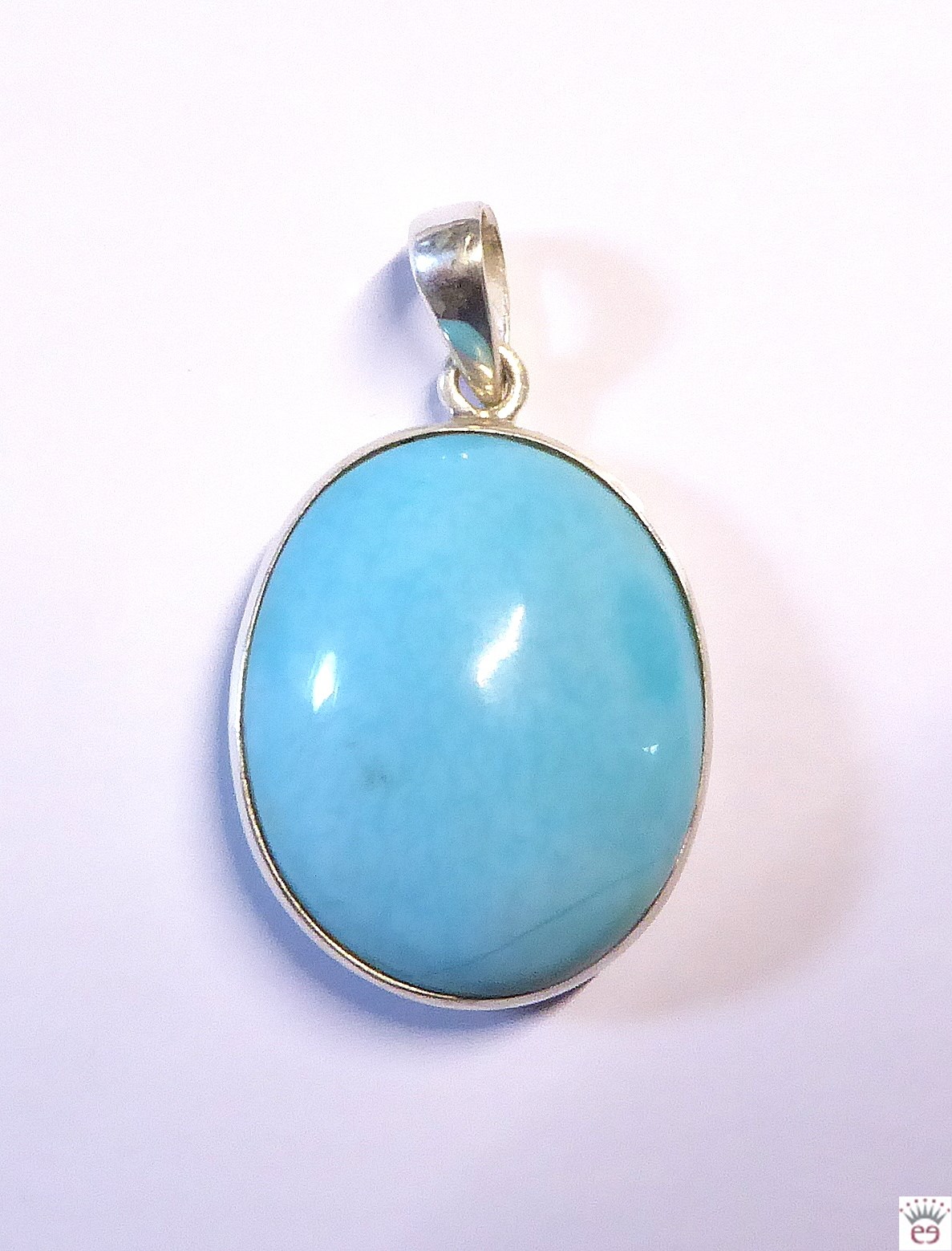 Silberanhänger mit einem Türkis-Cabochon in ovaler Form an einer großen Silberöse. Der Cabochon geht auf der Rückseite über die Fassung hinaus, schließt also nicht glatt mit der Fassung ab, sonder guckt sozusagen auf der Rückseite heraus.