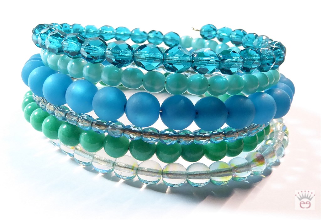 Wickelarmband aus Memory Wire mit grünen Jadeperlen, türkisfarbenen Polarisperlen sowie böhmischen Glasperlen und Rocailles in verschiedenen Grün-Türkistönen.